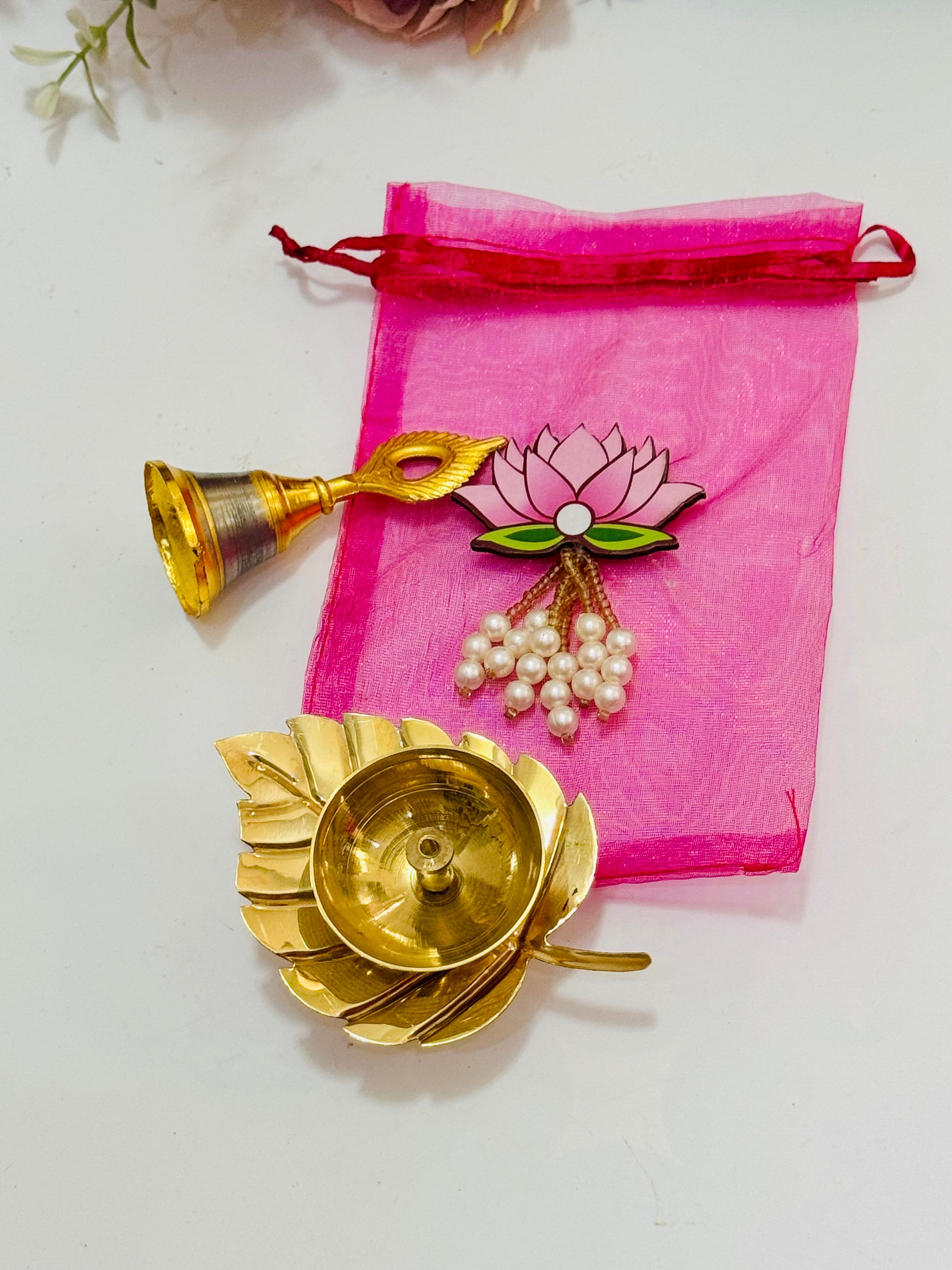 Bring home divinity and elegance with this festive gift set beautifully packed in a pink lotus motif organza potli.
