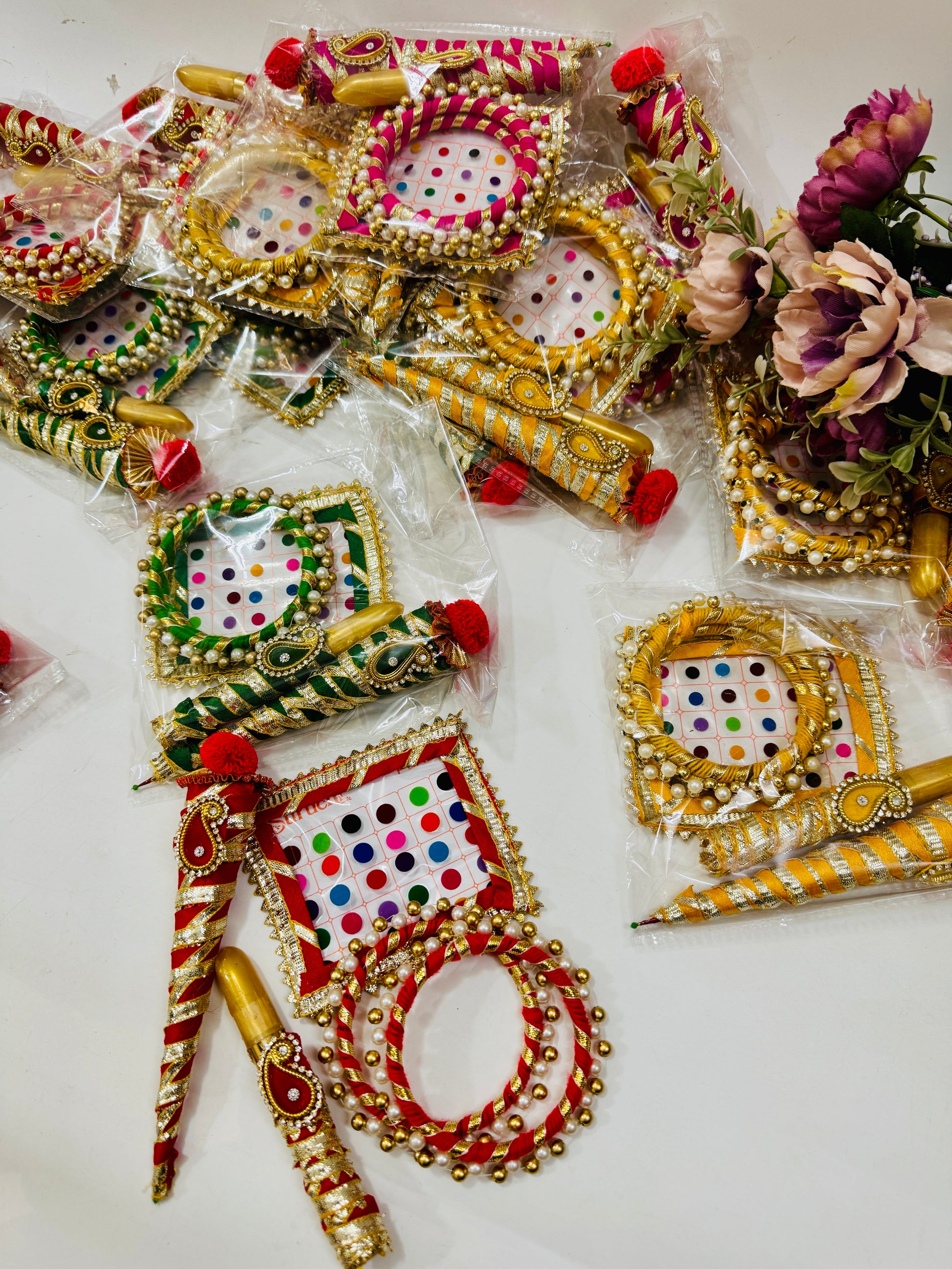 Celebrate traditional festivals with this beautifully handcrafted Suhag Pitara, perfect for Gangaur Pooja, Karwa Chauth, Teej, and other suhag rituals. This elegant set includes essential suhag items decorated with gota and pearl work, making it ideal for pooja thali, festive gifting, and return gifts.